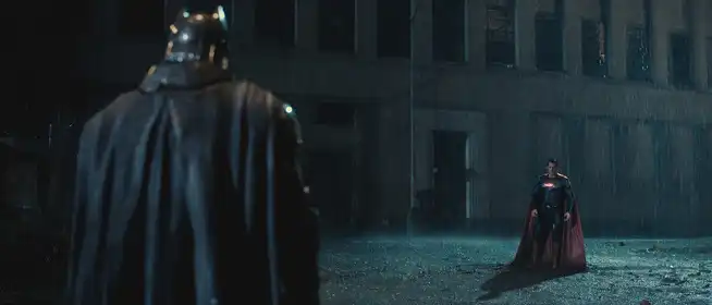 Контраст между богоподобным и человеческим — центральный мотор конфликтов. Бэтмен действует как представитель человеческого права, но его методы далеко не бесспорны. Его моральная дилемма отражает сложность принятия радикальных решений в условиях угрозы. Это делает персонаж трагическим: стремление защитить человечество приводит к отчуждению от него самого. Визуально противостояние подчёркнуто через использование света и тени: Супермен часто представлен на фоне яркого неба, тогда как Бэтмен — в тёмных, индустриальных тонах. Тем не менее фильм намеренно размывает эти контрасты в ключевых сценах, напоминающих, что добро и зло не всегда укладываются в простые визуальные метафоры.